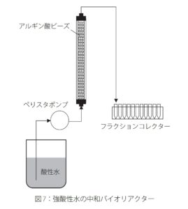 更に、アルギン酸ゲルビーズ(ジェルのような柔らかい極小のツブツブ)に包括したアルカリ化酵母をカラム (管のようなもの) 内に充填して、酸性水(pH3.6)を流入したところ、酵母が中和水(pH7前後)を連続的に生産した。この中和水をゼオライト(多孔質の吸着性を持つ物質。分子ふるいともいう)充填カラムに通したところ、pH 7近傍を維持した状態で水中のNH4+濃度を著しく減少させた。(論文本文中にはアルカリ化酵母の働きを弱めるアルミニウムの吸着も同じく可能なことが記載されている)。こうして、強酸性水から環境に優しい中性水を製造できるバイオリアクター(生体触媒を用いて生化学反応を行う装置)を構築することができた。
